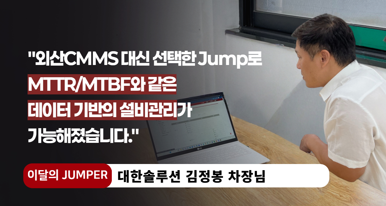 아직도 '수기가 편하다'고 말하는 분들이 있긴 하지만, 저는 잘 모르겠어요. Jump를 도입하고 나서 불필요한 비효율이 정말 많이 개선되었고, 저희의 일하는 방식이 완전히 바뀌었습니다. 불필요한 이중 작업이 사라졌고, 현장에서 입력된 데이터가 곧바로 MTTR/MTBF 같은 의미 있는 정보가 되어 돌아오죠. 설비 관리를 전산화하는 것이 부담스러울 수 있지만, Jump와 함께 변화를 시작하시라고 말씀드리고 싶습니다. |