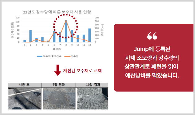 특히 누적된 데이터를 분석해 예산 낭비를 막은 사례도 있습니다. 지하차도 자재 데이터를 분석하던 중, 유독 여름철에 '도로 보수제' 사용량이 2배 급증하는 이상 패턴을 발견했습니다. 원인은 잦은 비로 인해 일반 보수제가 씻겨 내려갔기 때문이었죠. 이 데이터를 근거로 비에 강한 수경화성 보수제로 자재를 전격 교체했습니다. 단순한 재고 관리를 넘어, 데이터를 통해 현장의 자재 낭비를 막을 수 있었습니다.